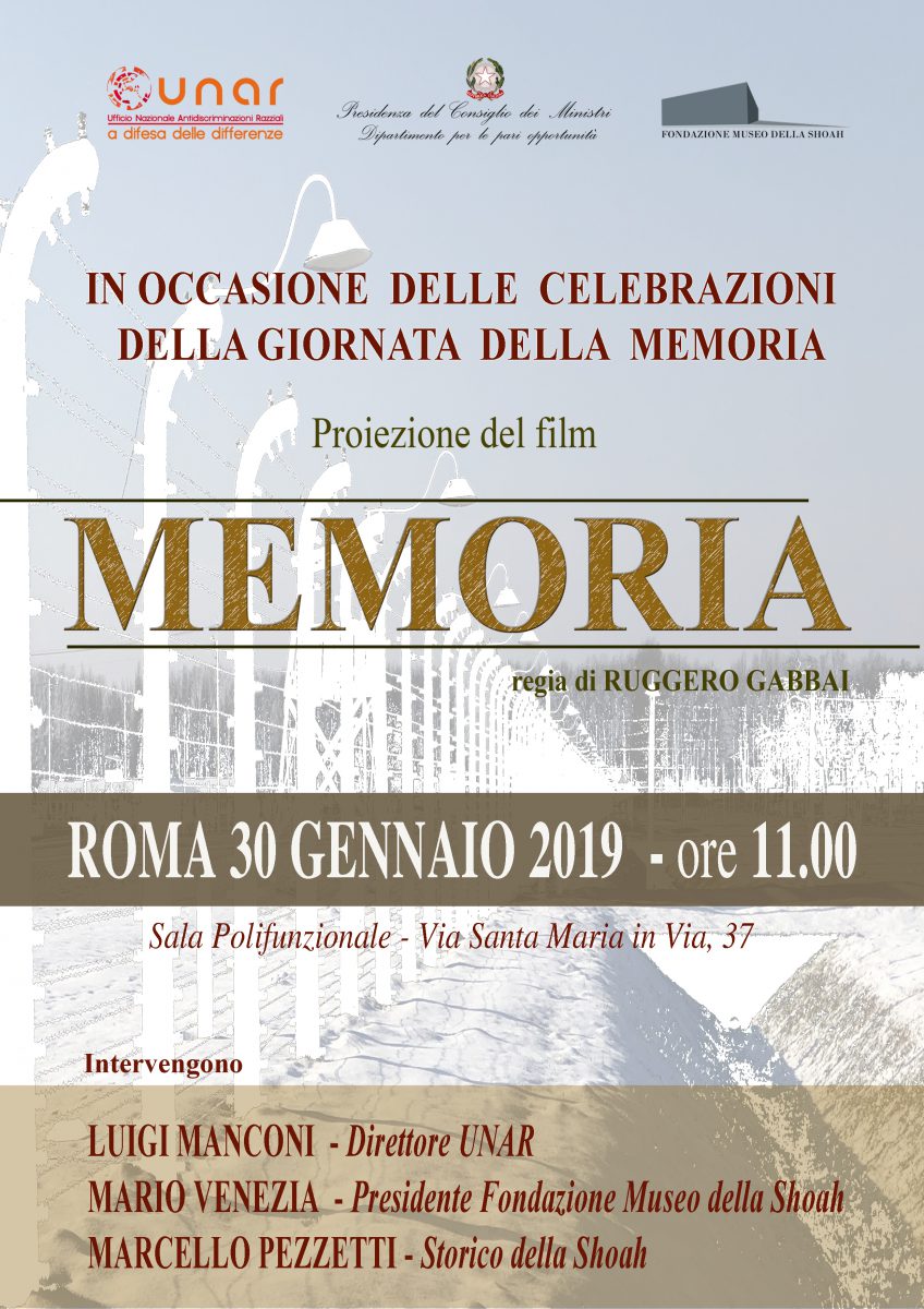 Si terrà a Roma, domani 30 gennaio 2019 a partire dalle ore 11.00 – presso la Sala Polifunzionale della Presidenza del Consiglio dei Ministri, Via Santa Maria in Via 37 – in occasione delle celebrazione della Giornata della Memoria, la proiezione del film documentario “Memoria. I sopravvissuti raccontano”, di Ruggero Gabbai su soggetto di Marcello Pezzetti e Liliana Picciotto.